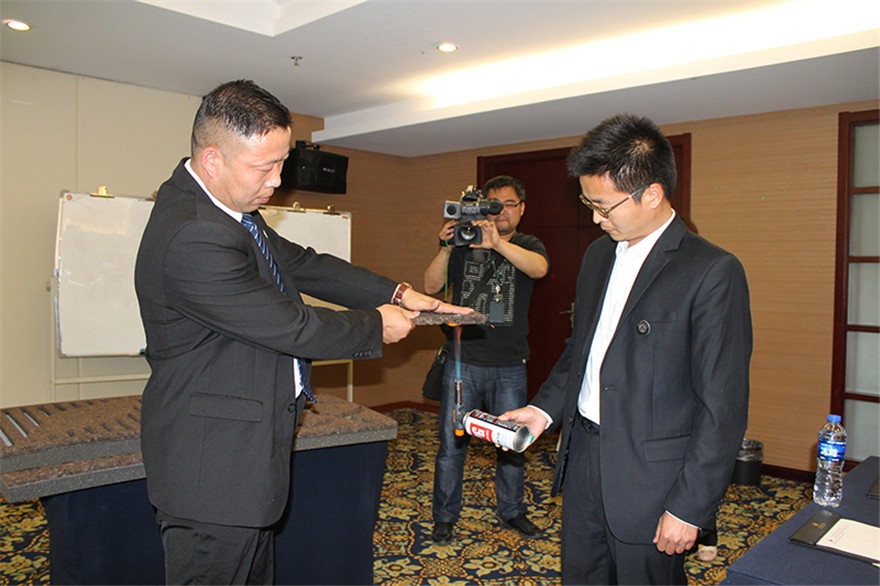 最后由江苏森之虎副总兼工程部负责人史巧林先生现场演示了葡萄牙软木板的隔热防火性能。