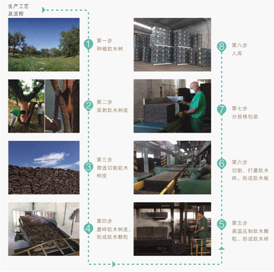 葡萄牙软木板采用蒸熏处理后膨胀的软木颗粒组成。颗粒间的黏合是由软木本身的树脂所造成,不使用任何合成药剂,生产过程中除软木颗粒外,无任何添加。