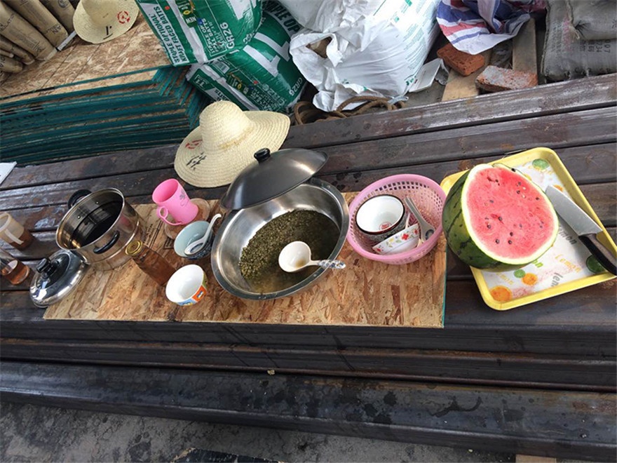 董事长亲临施工现场,为施工工人们送来清凉,他首先对大家表示了感谢:“为了公司的发展,你们辛苦了!”,并叮嘱工地负责人要每天做好后勤服务,绿豆汤、西瓜、人丹、饮料......充足供应,及时观察工人们的精神状态,确保安全施工,避免中暑。
